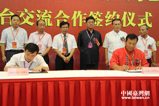 海南五指山市水滿鄉(xiāng)與臺灣嘉義縣阿里山鄉(xiāng)簽約。(中國臺灣網(wǎng) 李丹 攝)
