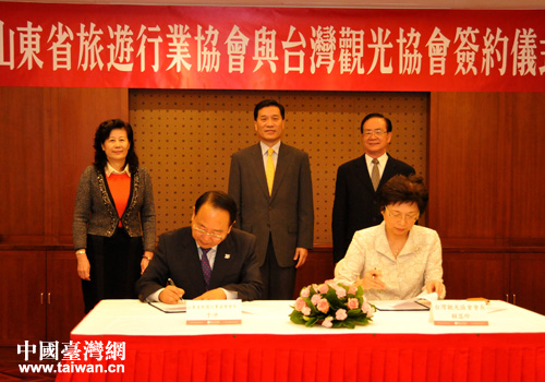 中國(guó)臺(tái)灣網(wǎng)10月31日臺(tái)北消息 日前,山東省旅游局和臺(tái)灣觀光協(xié)會(huì)在臺(tái)北圓山飯店簽訂合作協(xié)議,山東省旅游局于沖局長(zhǎng)、臺(tái)灣觀光協(xié)會(huì)賴瑟珍會(huì)長(zhǎng)代表魯臺(tái)雙方在合約上簽字。山東省夏耕副省長(zhǎng)、臺(tái)灣觀光協(xié)會(huì)張學(xué)勞榮譽(yù)會(huì)長(zhǎng)、山東省臺(tái)辦張雪燕主任等見(jiàn)證了簽字活動(dòng)。