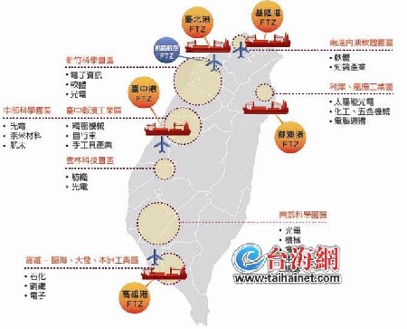 2013年,臺(tái)“行政院”核定了“自由經(jīng)濟(jì)示范區(qū)規(guī)劃方案”,希望透過“六海一空一農(nóng)技”的規(guī)劃,將自由貿(mào)易范圍由“區(qū)內(nèi)”逐漸擴(kuò)大到全臺(tái)灣。也就是說,“六海一空一農(nóng)技”是臺(tái)灣走向自由貿(mào)易的基石和起點(diǎn)。在這個(gè)提法之中,除去屏東農(nóng)業(yè)生技園區(qū)之外,其他“六海一空”恰好是臺(tái)灣最為重要的海運(yùn)和空運(yùn)港口所在地。在臺(tái)當(dāng)局自由經(jīng)濟(jì)示范區(qū)的兩階段推動(dòng)計(jì)劃中,今年8月啟動(dòng)的第一階段規(guī)劃強(qiáng)調(diào)在“六海一空”自由貿(mào)易港區(qū)內(nèi)采用“前店后廠”概念,在智慧運(yùn)籌、農(nóng)業(yè)價(jià)值運(yùn)銷及國際產(chǎn)業(yè)合作等領(lǐng)域,促進(jìn)人員、商品與資金自由流動(dòng)。