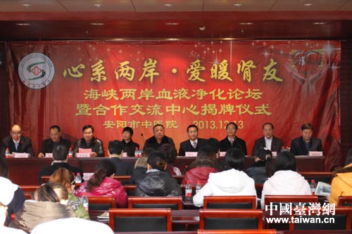 中國臺灣網12月17日安陽消息 日前,“海峽兩岸血液凈化論壇暨合作交流中心揭牌儀式”在安陽市中醫(yī)院舉行。安陽市政府副秘書長趙世輝、市衛(wèi)生局局長宋先忠,臺北市政府衛(wèi)生局副局長、醫(yī)學博士陳南松,等出席揭牌儀式。安陽市中醫(yī)院60余位醫(yī)護人員參加了揭牌儀式。