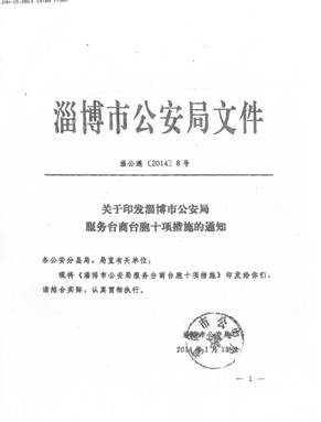 四、淄博市公安局出臺十項(xiàng)服務(wù)臺胞臺商措施在全市走訪季活動(dòng)中,市公安局根據(jù)臺商反應(yīng)臺胞證、駕駛證辦理等熱點(diǎn)問題,市政府黨組成員、市公安局局長丁冠勇親自帶隊(duì),由出入境管理分局牽頭,深入臺資企業(yè)進(jìn)行調(diào)研,了解臺商在淄博的工作生活情況,聽取臺商對我市公安系統(tǒng)的意見和建議,并根據(jù)公安部、省公安廳有關(guān)規(guī)定,在全市公安系統(tǒng)開展為臺商服務(wù)活動(dòng)。2013年12月17日下午,丁冠勇局長邀請市臺辦負(fù)責(zé)同志和駐淄臺商代表到市公安局進(jìn)行面對面座談,虛心聽取臺商在淄工作、生活中存在的問題和建議。在調(diào)研和廣泛征求意見的基礎(chǔ)上,市公安局下發(fā)了《關(guān)于印發(fā)淄博市公安局服務(wù)臺商臺胞十項(xiàng)措施的通知》,以最快辦理出入境簽證證件,最大限度按需延長臺胞來往大陸簽注、居留簽注有效期等十項(xiàng)措施。