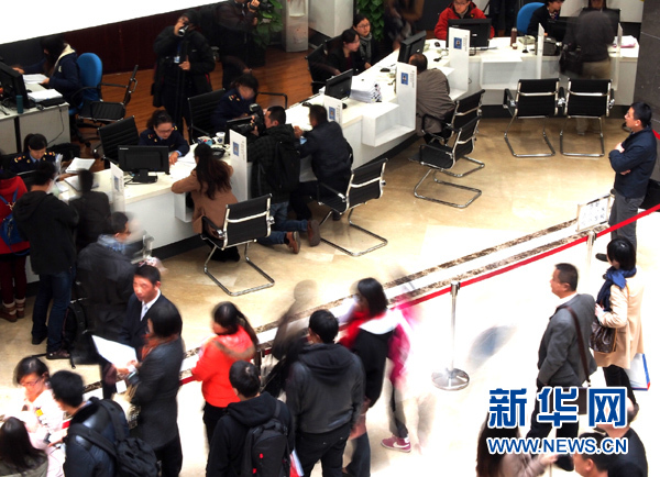 2013年12月4日,上海自貿(mào)區(qū)綜合服務大廳內人頭攢動。(新華社記者 陳飛 攝)