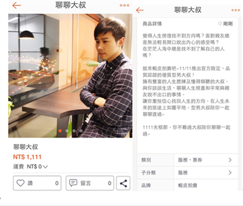 手機(jī)app在臺(tái)灣等地推出光棍節(jié)特別拍賣(mài):競(jìng)拍大叔陪聊。圖自《明報(bào)》網(wǎng)站