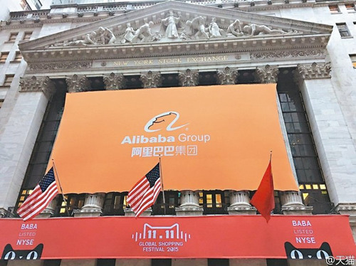 美東時(shí)間11月11日早晨,美國(guó)紐約交易所外墻掛起橙色阿里巴巴標(biāo)志和紅色天貓橫幅,向雙十一全球網(wǎng)購(gòu)節(jié)致意。 圖/取自天貓微博