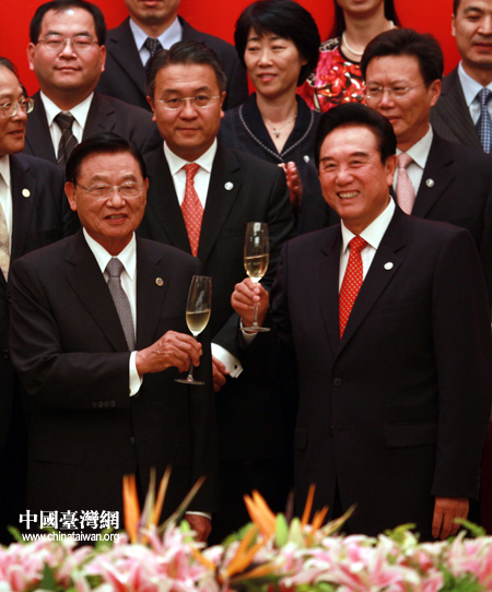 6月29日下午,海協(xié)會(huì)與臺(tái)灣;鶗(huì)在重慶順利簽署兩岸經(jīng)濟(jì)合作框架協(xié)議(ECFA)以及兩岸知識(shí)產(chǎn)權(quán)保護(hù)合作協(xié)議。圖為陳云林、江丙坤舉杯互致慶賀。(中國臺(tái)灣網(wǎng) 鐘寶華 攝)