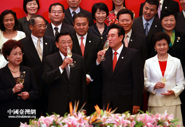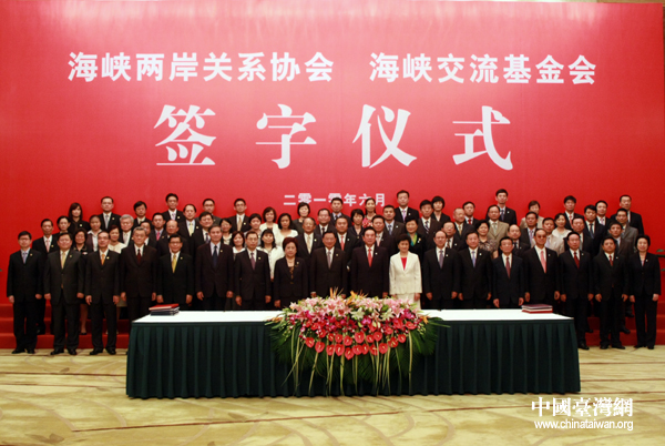 中國臺(tái)灣網(wǎng)6月29日重慶消息 今天下午2時(shí)30分許,海協(xié)會(huì)與臺(tái)灣;鶗(huì)在重慶申基索菲特大酒店,舉行兩岸經(jīng)濟(jì)合作框架協(xié)議(ECFA)以及兩岸知識(shí)產(chǎn)權(quán)保護(hù)合作協(xié)議簽字儀式。順利簽署后,陳云林、江丙坤同兩會(huì)代表團(tuán)成員合影留念,二人并舉杯互致慶賀。(記者 張弛 鐘寶華)