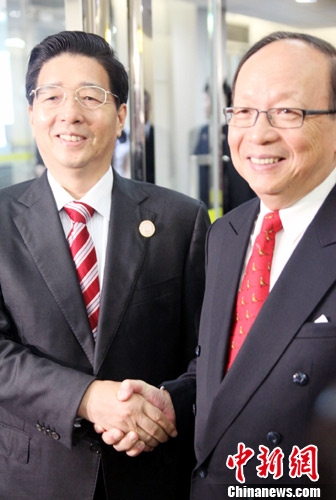 7月1日,應(yīng)中國國民黨中央委員會邀請,中共廣西壯族自治區(qū)黨委書記郭聲琨(中)率廣西經(jīng)貿(mào)文化代表團,乘包機自南寧飛抵臺灣桃園機場,展開為期5天的深化交流合作寶島行。這是兩岸簽署經(jīng)濟協(xié)議ECFA后,第一位訪臺的大陸正省級官員。中新社發(fā) 黃少華 攝