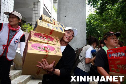 8月15日,李連杰(前左二)在臺灣高雄縣六龜鄉(xiāng)與義工一起搬運(yùn)救災(zāi)物資。