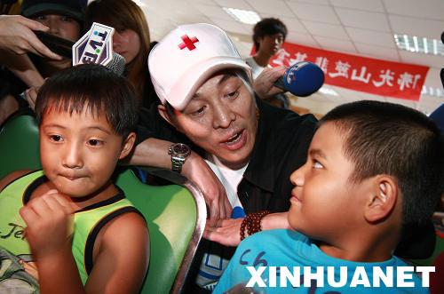 8月15日,李連杰(中)在臺灣高雄縣旗山鎮(zhèn)災(zāi)民收容所,與高山族小朋友共唱《我們是一家人》。