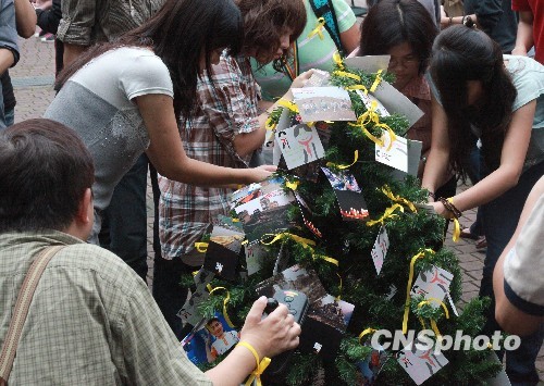 5月13日,“紀(jì)念汶川地震兩周年暨玉樹(shù)地震周月”全臺(tái)陸生聯(lián)合紀(jì)念活動(dòng)在臺(tái)灣世新大學(xué)啟動(dòng),這是在臺(tái)陸生第一次跨校聯(lián)合舉辦活動(dòng)。臺(tái)灣的清華大學(xué)、交通大學(xué)、世新大學(xué)、義守大學(xué)、輔仁大學(xué)等高校數(shù)百名來(lái)臺(tái)短期研修的陸生,與臺(tái)灣同學(xué)一道,為汶川祈福,為玉樹(shù)祈福,為兩岸同胞祈福。圖為兩岸學(xué)子在世新大學(xué)紀(jì)念活動(dòng)現(xiàn)場(chǎng)的祝福樹(shù)上系黃絲帶、掛祝愿卡。中新社發(fā) 羅欽文 攝