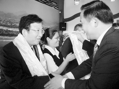 圖為四川方面向臺灣工程界代表(左)敬獻(xiàn)哈達(dá)表示感謝,并祝愿吉祥如意,幸福安康。(徐蕾 攝)