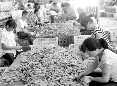 近年來,龍海市工商局通過深入臺商投資的食品企業(yè)調(diào)查,發(fā)現(xiàn)許多食品企業(yè)生產(chǎn)需要大量的黃秋葵,于是積極引導多家臺企與當?shù)貣|園鎮(zhèn)、海澄鎮(zhèn)村民簽訂訂單合同。日前,黃秋葵大獲豐收,當?shù)剞r(nóng)戶種植黃秋葵每畝純收入可達3500元,該市有東園鎮(zhèn)、海澄鎮(zhèn)訂單種植黃秋葵面積達6000多畝,農(nóng)民可增收2000多萬元。鄭愛國 宋文龍 攝