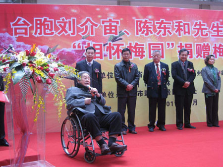 臺胞劉介宙、陳東和先生贈送給鼓山的兩千多株梅花樹,在暖暖的春意中已綻放出紅粉的小花,昨天捐贈儀式和“福州鼓山相懷梅園”的揭牌儀式在鼓山新梅園舉行。年過八旬的劉介宙先生特地從臺灣趕來出席了捐贈儀式,以“相懷”之名傳達“兩岸相懷”的美好愿望。