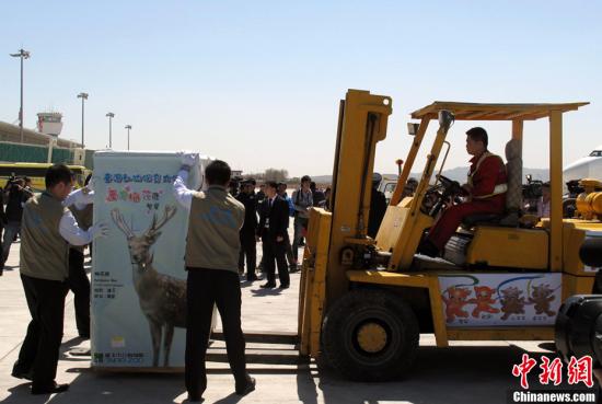 資料圖:4月16日12時30分許,“繁星”、“點點”、“喜羊羊”、“樂羊羊”順利抵達威海機場。圖為劉公島國家森林公園工作人員與機場人員配合將“寶貝”們接上專用運輸車輛。劉舒凌 攝