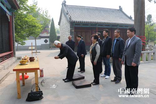 在王氏宗親的陪同下來到祖堂,臺胞王錫承率家人一起祭拜祖先。