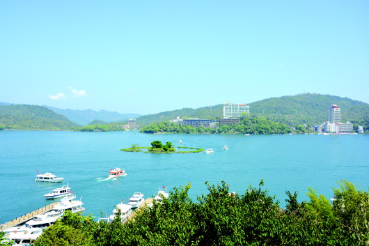 日月潭湖水如夏日的藍(lán)天那般藍(lán)得溫吞。