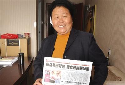 鄭州市中原區(qū)西流湖辦事處孫莊村的耿金愛女士,去臺灣旅行時,不巧背包丟失,被人拾到后歸還,包內(nèi)身份證等物原封未動,耿女士當即捐出10萬元新臺幣(約合人民幣2萬元)給拾到她包的飯店員工,飯店和員工決定把10萬新臺幣捐給相對困難的區(qū)公所,當做該所的老人幸福食堂基金,耿女士的愛心之舉登上了當?shù)貓蠹堫^條。