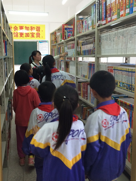 鵝公鎮(zhèn)中心小學的學生在老師帶領下進入圖書室借書