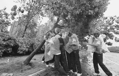 兩岸大學(xué)生攜手把路邊被臺風(fēng)刮倒的樹扶正。