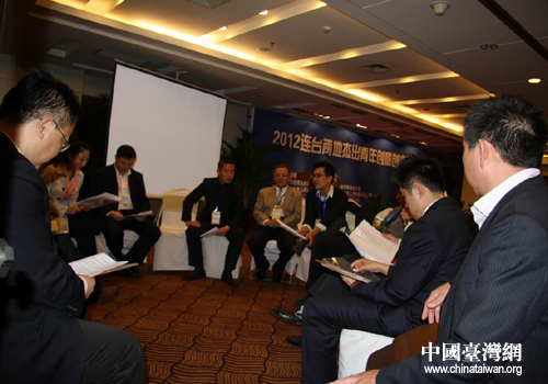 參加2012連臺兩地杰出青年創(chuàng)意創(chuàng)業(yè)論壇的與會人員交流座談。(圖片來源:大連市臺辦)