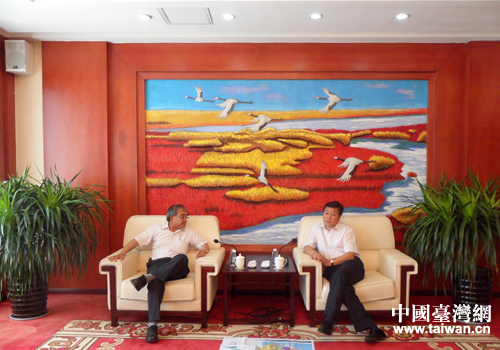 臺灣見龍機構(gòu)總經(jīng)理洪介文同盤錦市常務(wù)副市長高科進行洽談。(盤錦市臺辦 李賀 攝)
