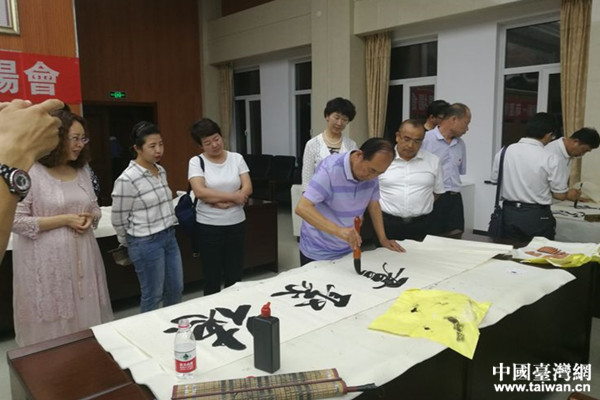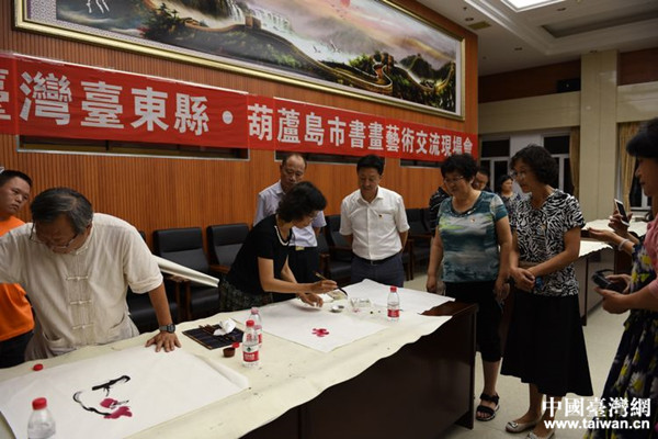 2018年8月14日,遼寧省葫蘆島市臺辦、市文聯(lián)、市臺聯(lián)、市民革聯(lián)合舉辦了“臺灣臺東縣·葫蘆島市書畫藝術(shù)交流現(xiàn)場會”。(中國臺灣網(wǎng)遼寧臺辦通訊員 周大偉)