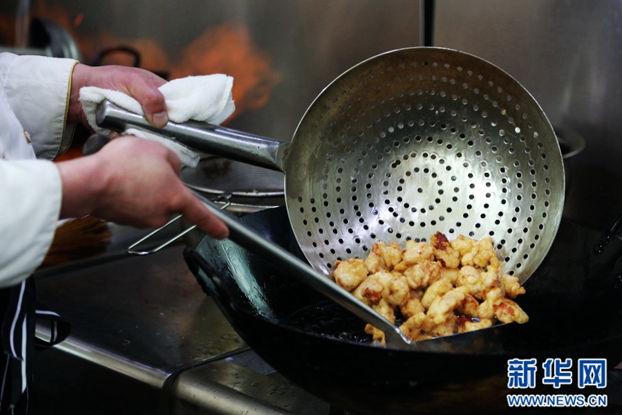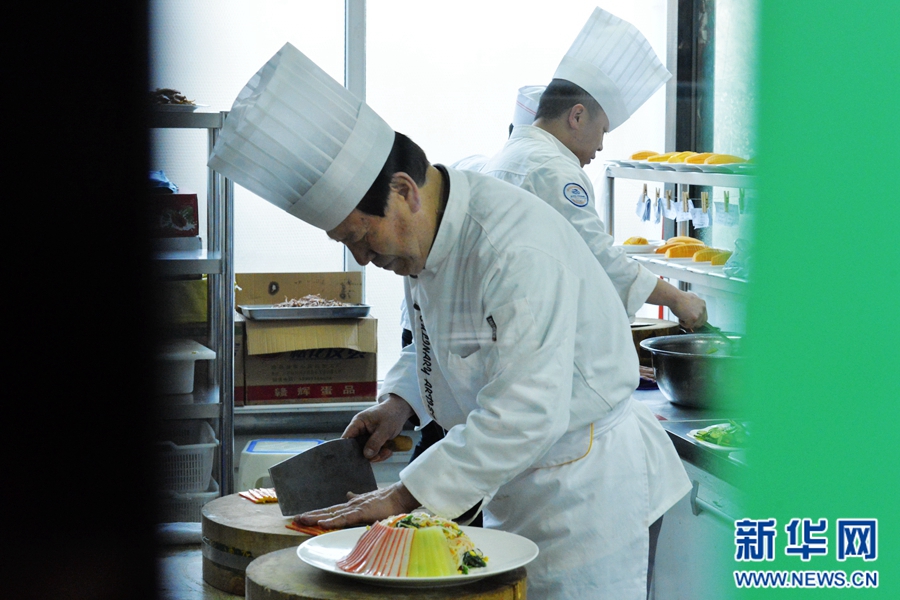 透過櫥窗,范增福和他的徒弟們正在廚房里準(zhǔn)備食材。新華網(wǎng) 王小龍攝
