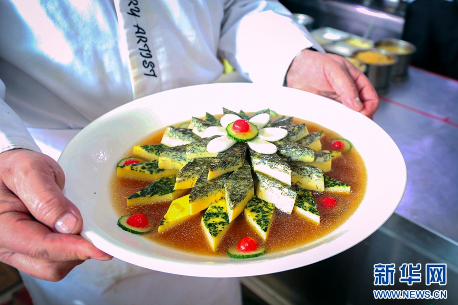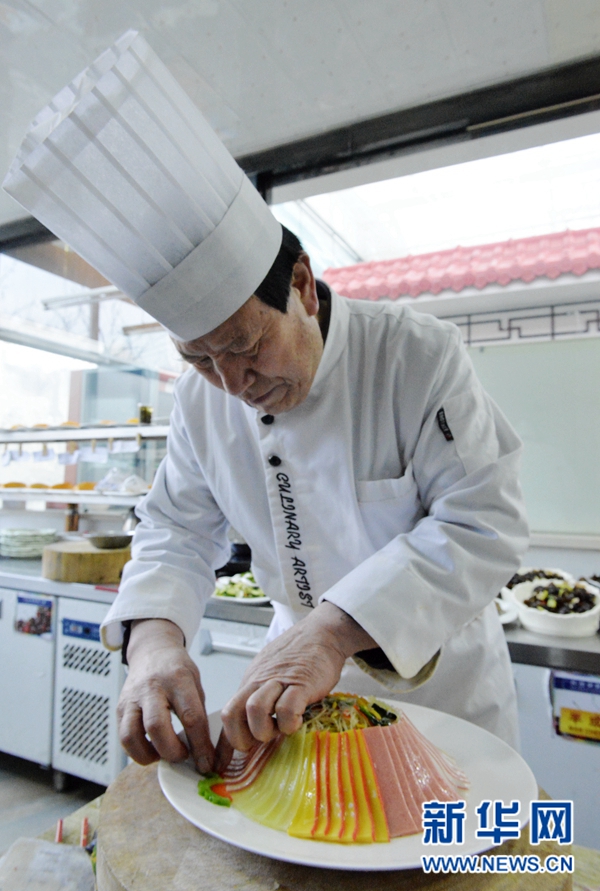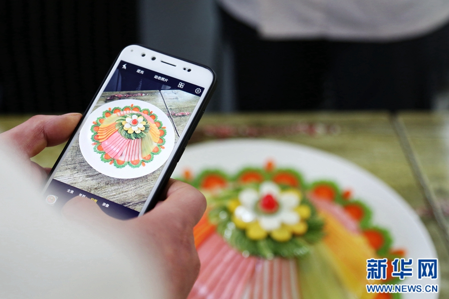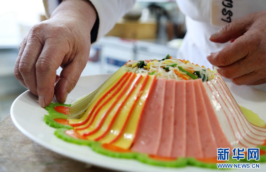 范增福正在細(xì)心地?cái)[盤。“全盤的制作非常講究,拼盤的食材都要切得整齊劃一,擺出來才最好看。”范增福說。