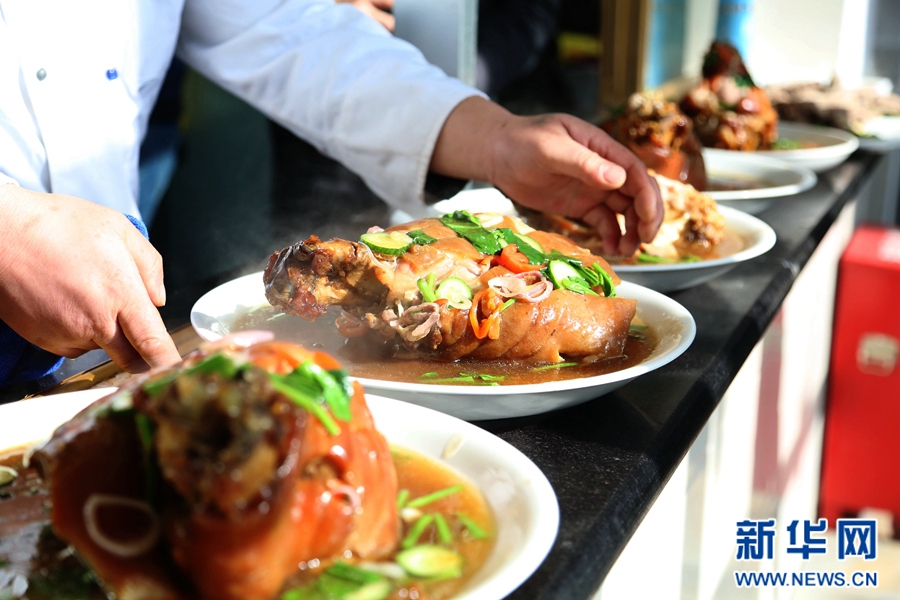 “老八盤”中的又一道經(jīng)典菜——霸王肘子出鍋裝盤。這道菜肉質(zhì)酥爛,老少咸宜。