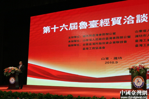 中共山東省委副書記、省長姜大明在致辭中表示,山東將緊緊抓住兩岸經(jīng)濟(jì)合作框架協(xié)議簽署的有利時機(jī),繼續(xù)大力推動魯臺兩地在先進(jìn)制造業(yè)、高新技術(shù)產(chǎn)業(yè)、節(jié)能環(huán)保產(chǎn)業(yè)、現(xiàn)代服務(wù)業(yè)和現(xiàn)代農(nóng)業(yè)等重點區(qū)域的合作,積極貫徹中央惠及臺灣同胞的各項政策措施,改善投資環(huán)境,依法維護(hù)臺灣同胞的正當(dāng)權(quán)益,幫助臺資企業(yè)轉(zhuǎn)型升級,促進(jìn)臺資企業(yè)在山東的持續(xù)發(fā)展壯大,推動魯臺經(jīng)濟(jì)合作朝著更深層次延伸。