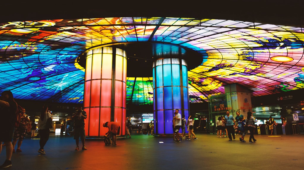 高雄不只有“駁二”,還有美麗島捷運(yùn)站,據(jù)說(shuō),這是來(lái)高雄最不能錯(cuò)過(guò)的景點(diǎn)之一。美麗島捷運(yùn)站由日本后現(xiàn)代主義建筑師高松伸設(shè)計(jì),這個(gè)號(hào)稱“世界第二美”的地鐵站,也已成為城市的藝術(shù)象征。地鐵站內(nèi),由意大利藝術(shù)家水仙大師親手打造的“光之穹頂”是主景點(diǎn)·,穹頂畫包含“水”、“土”、“光”、“火”四大區(qū)塊,傳遞人性的價(jià)值,闡釋人與人、環(huán)境、及萬(wàn)物之間的關(guān)系。穹頂?shù)墓馍r明,圖像形態(tài)各異,同樣也是迅速吸引參觀者的目光,形成強(qiáng)烈的視覺(jué)沖擊。從穹頂大廳走上地面,有四個(gè)玻璃帷幕的出口,而這四個(gè)出口的設(shè)計(jì),恰如合掌姿態(tài),蘊(yùn)含“祈禱民生和平”的概念。