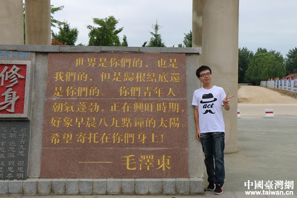 臺灣學生與毛澤東語錄碑合影留念。(圖片來源:日照市臺辦)