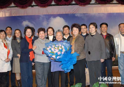 捐獻(xiàn)儀式現(xiàn)場(chǎng),臺(tái)胞老黨員柯倩與林明月會(huì)長等與會(huì)領(lǐng)導(dǎo)合影(王茜 攝)
