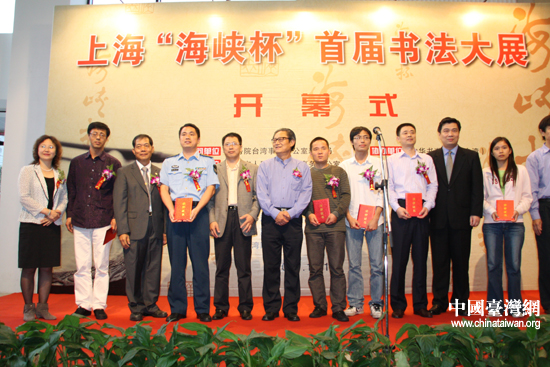 上!昂{杯”首屆書法大展10月11日在上海圖書館隆重開幕,部分頒獎嘉賓與獲獎作者合影。(中國臺灣網(wǎng) 李桂英 攝)