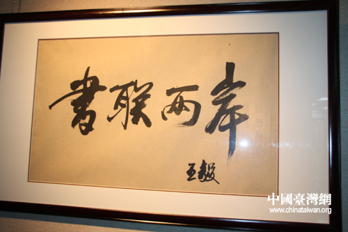 海協(xié)會會長陳云林書法作品“秦篆漢隸書兩岸關系 魏碑唐草寫民族復興” (中國臺灣網 李桂英 攝)
