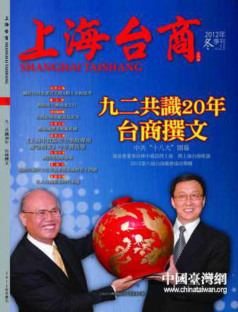 中國臺灣網(wǎng)11月14日上海消息 “九二共識”達(dá)成二十周年之際,上海臺商紛紛在新出版的2012年冬季刊《上海臺商》雜志上撰文,表示“九二共識”是兩岸經(jīng)濟(jì)共創(chuàng)雙贏的重要保障,應(yīng)珍惜“九二共識”的成果,繼續(xù)深化和發(fā)展“九二共識”精神。