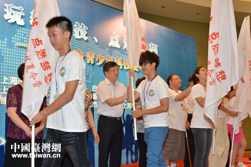 與會嘉賓向參加此次夏令營活動的各校學(xué)生代表授營旗。(上海市臺辦 葛鳳章 攝)