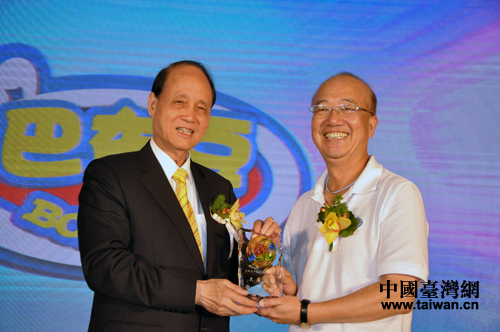 ;鶗(huì)董事長(zhǎng)林中森向巴布豆董事長(zhǎng)林啟東贈(zèng)送禮物。(玉龍攝)