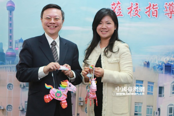 上海臺(tái)商子女學(xué)校董事長(zhǎng)楊奕蘭向王郁琦贈(zèng)送學(xué)生制作的小馬燈。(中國(guó)臺(tái)灣網(wǎng) 田云鵬)