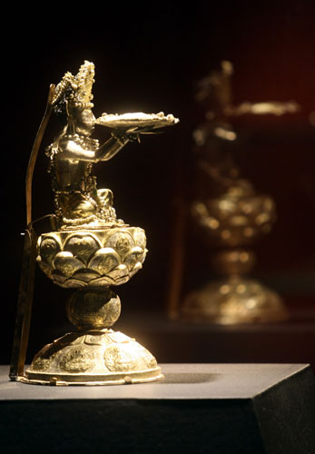 “盛世皇朝秘寶─法門寺地宮與大唐文物特展”28日在臺(tái)北歷史博物館舉行開幕記者會(huì),展品中超過(guò)一半是大陸1級(jí)文物。圖為敬獻(xiàn)佛指舍利的捧真身菩薩。 圖片來(lái)源:“中央社”