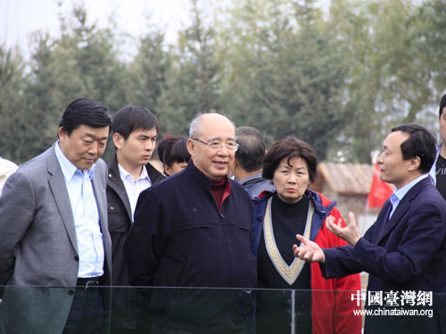 中共西安市委宣傳部部長(zhǎng)王軍向吳伯雄一行介紹西安世園會(huì)建設(shè)情況。(陜西臺(tái)辦張群莉 攝)