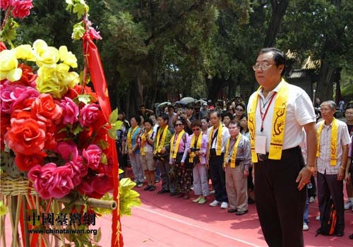 臺(tái)灣文化大學(xué)教授周談?shì)x向黃帝陵敬獻(xiàn)花籃(陜西省臺(tái)辦 張群莉 攝)