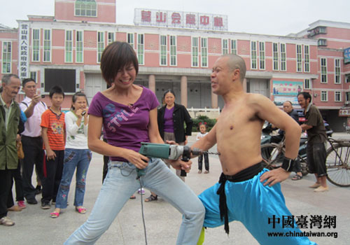 “中國(guó)金鐘罩鐵布衫第一人”的胡瓊場(chǎng)表演電鉆鉆人體(圖片來源:南充市臺(tái)辦)