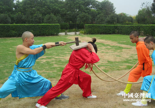 中國(guó)臺(tái)灣網(wǎng)9月26日南充消息 日前,臺(tái)灣東森電視臺(tái)企劃陳佳筠、主持人許晶晶和和福建海峽衛(wèi)視編導(dǎo)譚薇薇率記者一行5人到四川南充營(yíng)山,對(duì)被譽(yù)為“中國(guó)鐵掌第一人”、“中國(guó)金鐘罩鐵布衫第一人”的胡瓊領(lǐng)隊(duì)的武術(shù)絕技表演團(tuán)錄制了一期關(guān)于武術(shù)絕技展示專題節(jié)目。