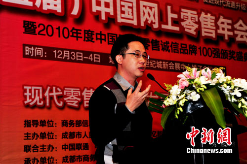 12月4日,在成都舉行的第五屆中國(guó)網(wǎng)上零售年會(huì)上,臺(tái)北市消費(fèi)者電子商務(wù)協(xié)會(huì)理事、網(wǎng)勁科技CEO游士逸在演講中表示,互聯(lián)網(wǎng)世界唯一的國(guó)界是語(yǔ)言。英文過(guò)去是第一市場(chǎng)。但華人在全世界分布廣泛。臺(tái)灣正在推動(dòng)華人電子商務(wù)市場(chǎng)行動(dòng)計(jì)劃。兩岸共同的文字、語(yǔ)言、文化背景正是電子商務(wù)合作的前景。兩岸將有機(jī)會(huì)打造以華人語(yǔ)言為交流工具的“華人獨(dú)有的電子商務(wù)市場(chǎng)”。圖為游士逸在年會(huì)上發(fā)表演講。中新網(wǎng)發(fā) 安源 攝