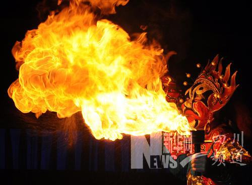 2月6日,來自四川的演員在臺(tái)北表演四川傳統(tǒng)“絕活”《吐火》。