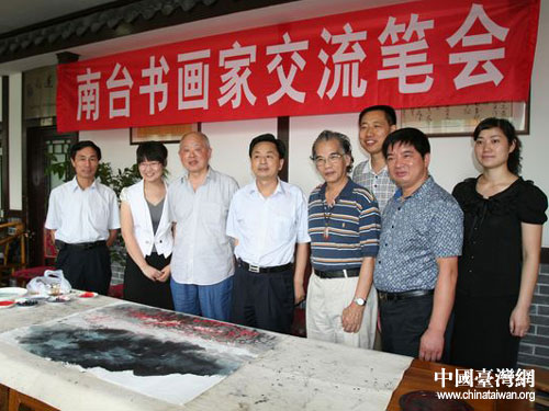 市外僑辦領(lǐng)導(dǎo)及部分人員與南臺(tái)書畫家合影。(南充臺(tái)辦張國友 攝)