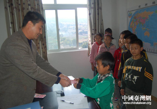 攀枝花市大龍?zhí)吨行男O蚴苤鷮W生發(fā)放2011年秋季學期彭陰剛先生捐助款。(圖片來源:攀枝花臺辦)
