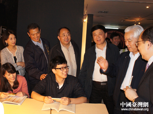 四川省政協(xié)主席陶武先與正在展場參觀的臺灣青年觀眾交流。(圖片來源:四川省臺辦)