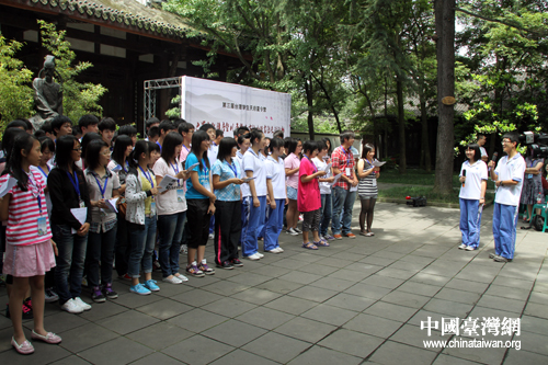 7月4日下午,參加第三屆“臺(tái)灣學(xué)生天府夏令營(yíng)”活動(dòng)的105名師生與成都七中的學(xué)生們一道漫步杜甫草堂,聽(tīng)取巴蜀文化講座,共同吟誦“詩(shī)圣”杜甫的名篇佳作,感受中華文化源遠(yuǎn)流長(zhǎng)。(中國(guó)臺(tái)灣網(wǎng) 王偉 攝)